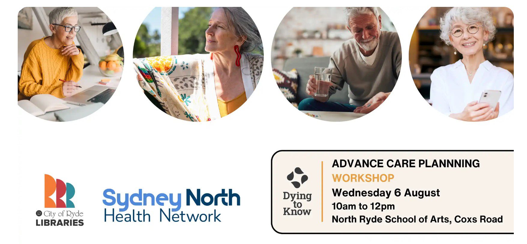 Aug 6 Advance Care Planning Workshop: Ryde 10:00 am - 12:00 pm North Ryde School of Arts 201 Coxs Road, North Ryde Event Details Get Directions