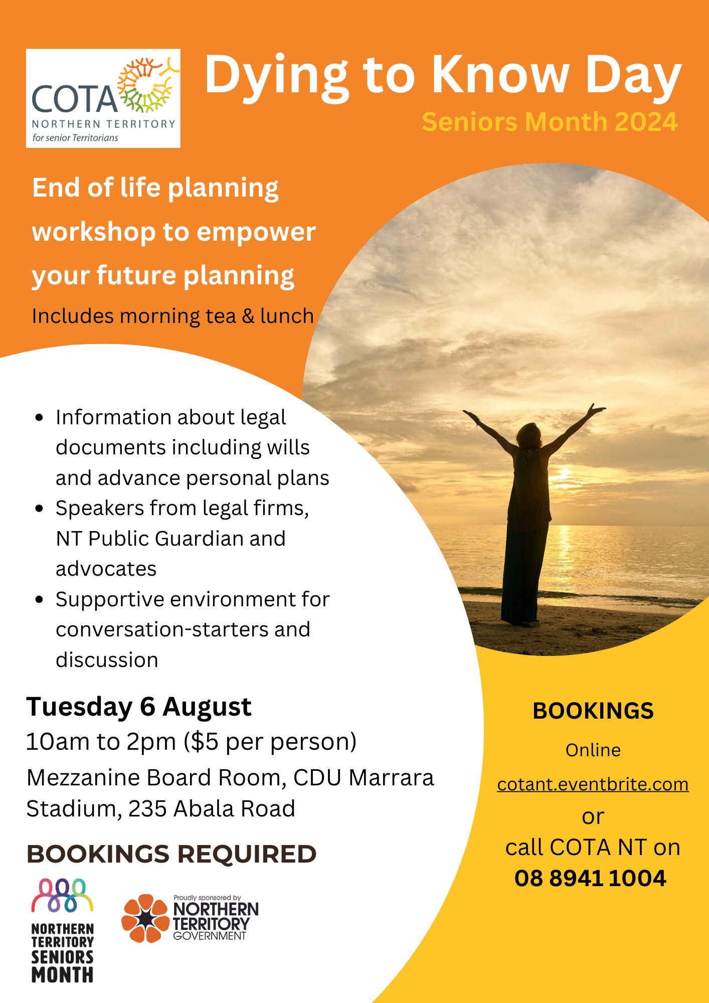 Aug 6 Dying to Know Workshop 10:30 am - 2:00 pm CDU Marrarra Stadium 235 Abala Road, Marrara Event Details Get Directions