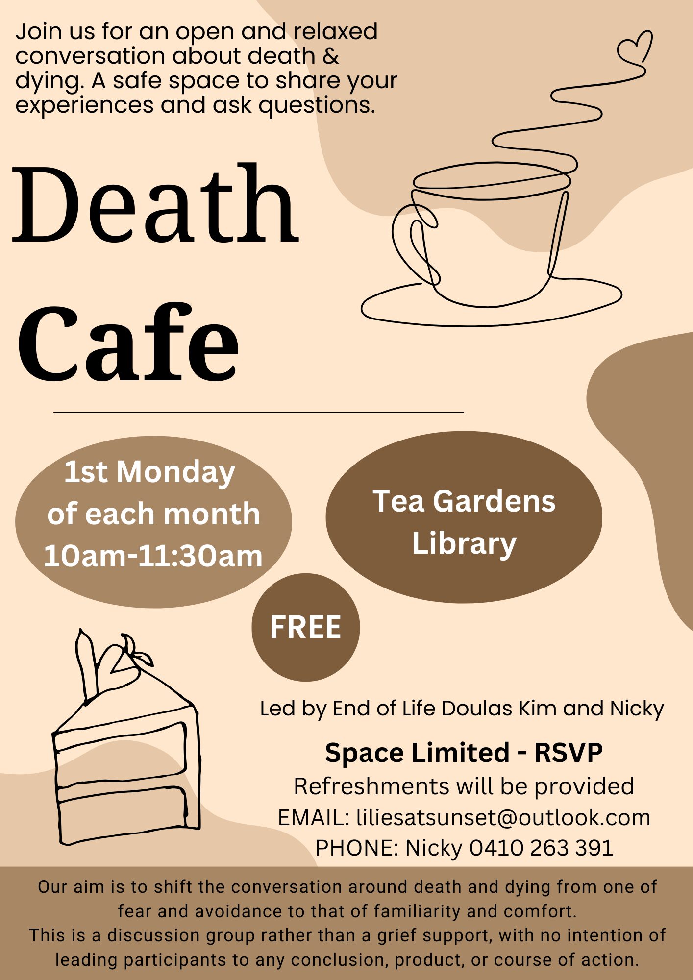 Death Cafe, Tea Gardens NSW August 5, 2024 @ 10:00 am - 11:30 am AEST Tea Gardens Library Marine Drive, Tea Gardens, Mid-Coast Council, Australia Death Cafe - monthly meeting at Tea Gardens Library. In August 2024 we have a special guest for this important week (Dying to Know). Local Solicitor, Emma Rowles… Free